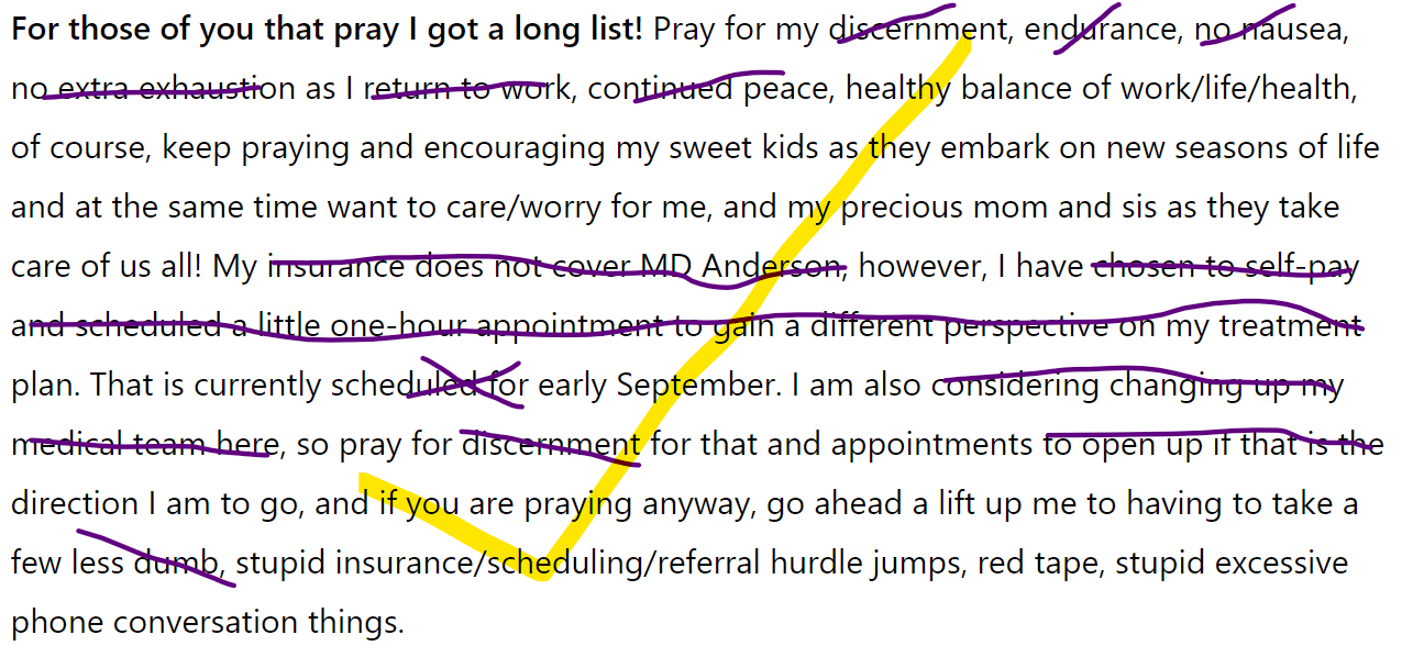 My prayer requests: 1. easy surgery July 2nd and the recovery, 2. easing of side effects >>>sleeping/resting, intestinal health and ease/relief from ITCHING!, 3.my kids as they each face challenges and triumphs in their own lives, 4. Wedding planning & prep! Lydia and Hayden get married, August 11th!